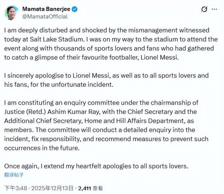 目前,梅西已经离开加尔各答并前往下一站。加尔各答所属的西孟加拉邦首府首席部长玛玛塔·班纳吉公开发文,向梅西致歉:“今天在盐湖体育场的管理失责让我震惊。对此不幸事件,我要向梅西、所有体育迷以及球迷致歉。我们已成立委员会,调查此事。再次致歉。”