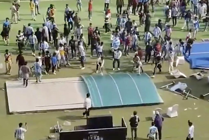 出于对安全因素的考虑,在待了10分钟后,梅西要求安保人员带他离开。现场球迷发出了更大的嘘声。而在梅西离开后,球迷彻底怒了,他们不断向球场内扔水瓶、椅子,还有人冲下球场打砸设施。