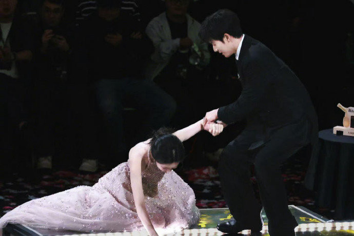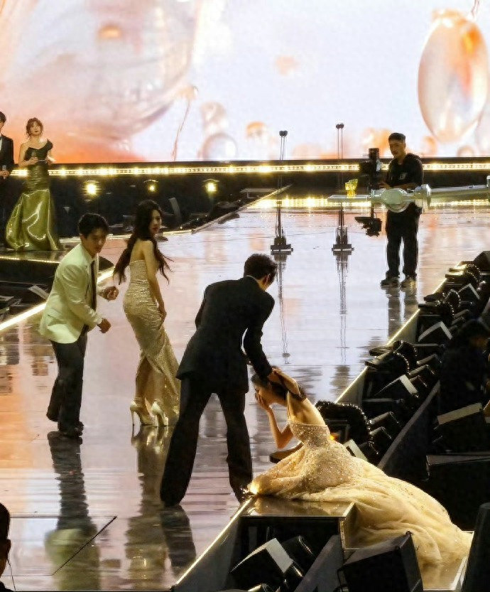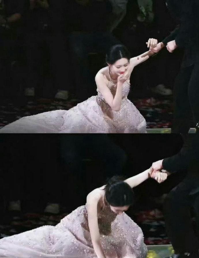 孟子义的“神摔”堪称一场充满戏剧性的意外馈赠。当时她正与白鹿、丞磊、李昀锐一同上台领取“最受期待剧集”奖,拖地的高定裙摆不慎被高跟鞋勾住,膝盖重重磕在台阶上,现场都能清晰听到碰撞声。但这尴尬的瞬间却因众人的真实反应焕发别样光彩:孟子义第一时间检查膝盖,没有慌乱失措;身旁的李昀锐急着搀扶却险些一同滑倒,被网友调侃像“拔萝卜”;丞磊松开白鹿的手转身回望,白鹿惊呼着上前相助,就连台下的丁禹兮都下意识起身伸手。摄影师精准捕捉到这一幕,破碎感与守护感交织,构成了兼具美感与温度的“神图”,让网友感叹“别人摔倒是社死,孟姐摔倒是名场面”。