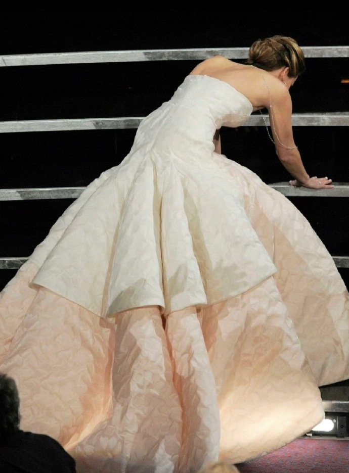 更圈粉的是孟子义的坦荡应对。发表感言时,她大方自嘲“去年摔了,今年又摔了,我明年一定不会摔了”,一句话化解所有尴尬,赢得全场善意的笑声。这份不扭捏、不回避的态度,恰与九年前詹妮弗·劳伦斯的表现形成奇妙呼应。2013年奥斯卡颁奖典礼上,凭借《乌云背后的幸福线》封后的詹妮弗,身着淡粉色曳地长裙踏空台阶,重重摔倒在领奖台上。面对全球观众的目光,她笑着撑起身体整理裙摆,接过奖杯时还不忘调侃“你们看到了吧,我刚才真的摔得很惨”,那份不卑不亢的从容,让意外瞬间变成彰显个性的高光时刻。