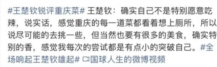 在王楚钦首轮战胜丹麦选手格罗特的时候,记者就问到王楚钦对于重庆美食的感受,王楚钦直言自己不太能吃辣,感觉每一道重庆菜看着都想上厕所,随后也可能是怕球迷误会,王楚钦又说重庆还是有很多美食的,但他的每一次尝试都是一次不小的突破。